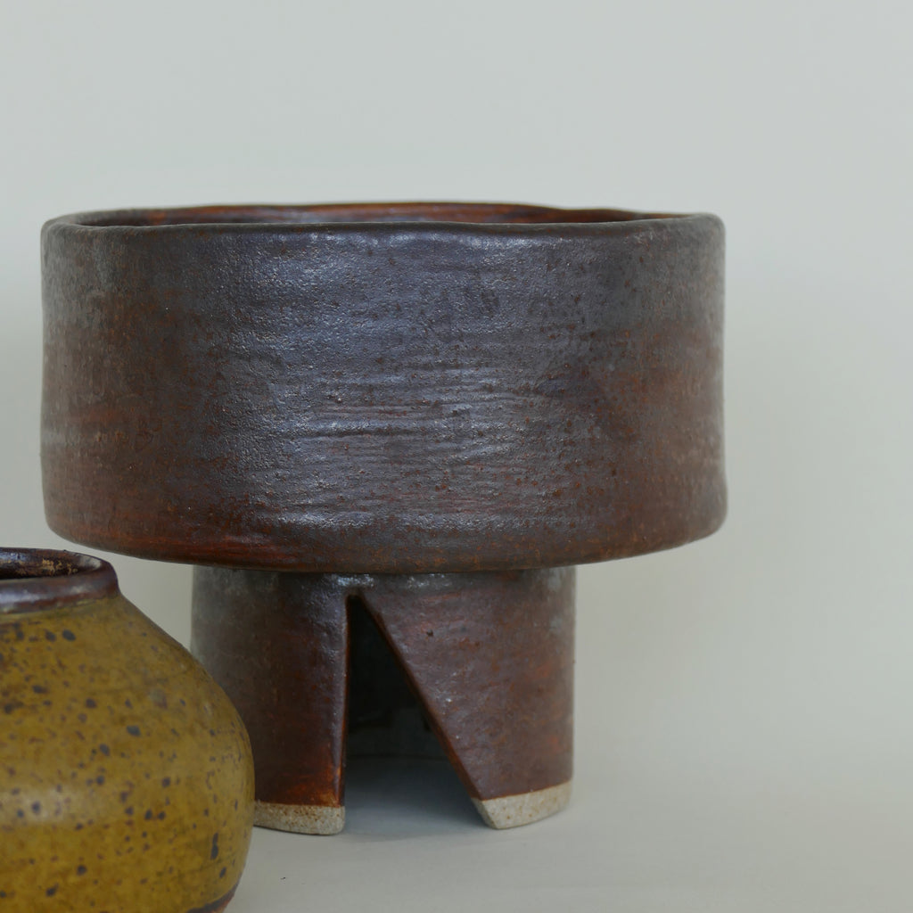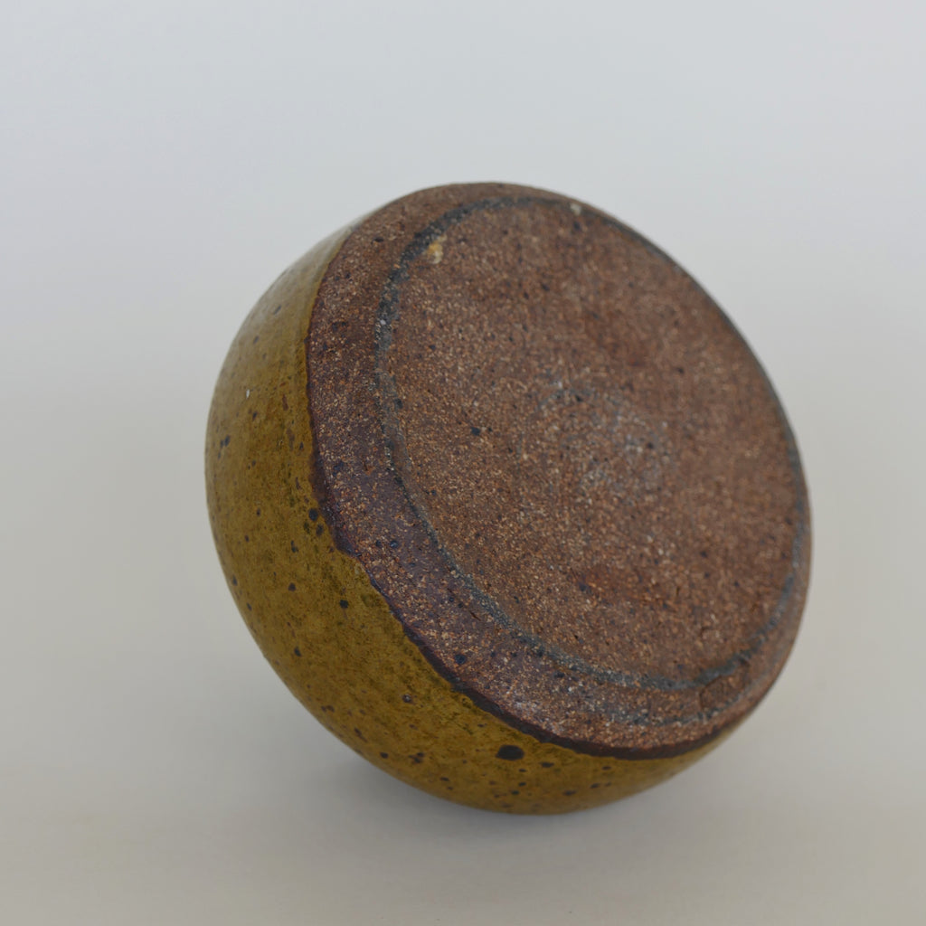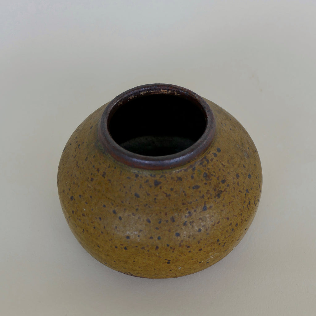 Squat, inkwell shaped ochre speckled pottery. Excellent condition.