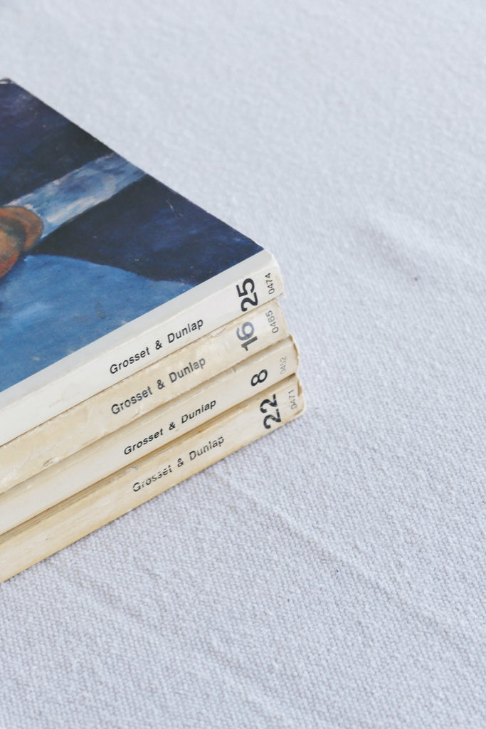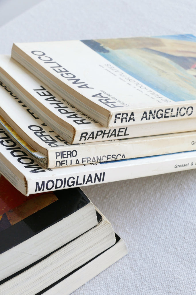 Set of four small vintage art reference books; text and color images. Ideal for styling and enjoying. Includes: Fra Angelico, Raphael, Piero Della Francesca, and Modigliani. Worn, but good vintage condition.
