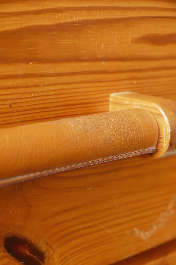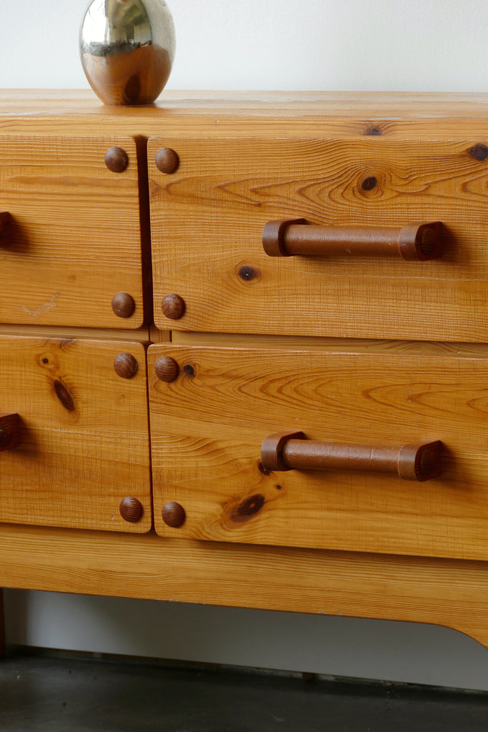 Vintage set of drawers by Christian Langström for Ab Nybrofabriken's "Kap Horn" collection, circa 1970s. Pine construction with leather wrapped handles. An amazing and special rare piece. Light all-over surface wear (as visible in photos). Petite in size, this low dresser is great for storage in a small living space bedroom, or as entry way table. One of our current favorites!