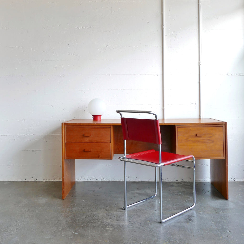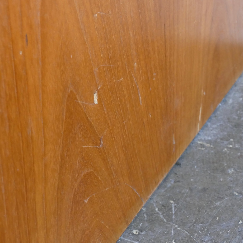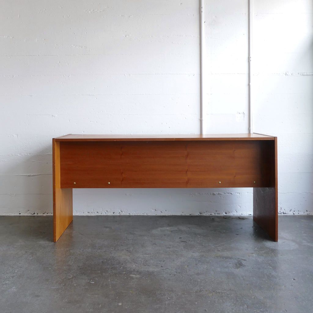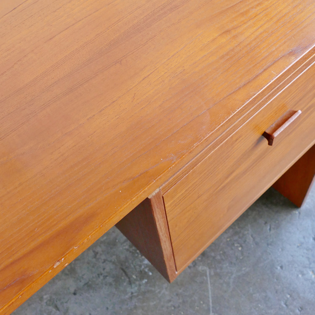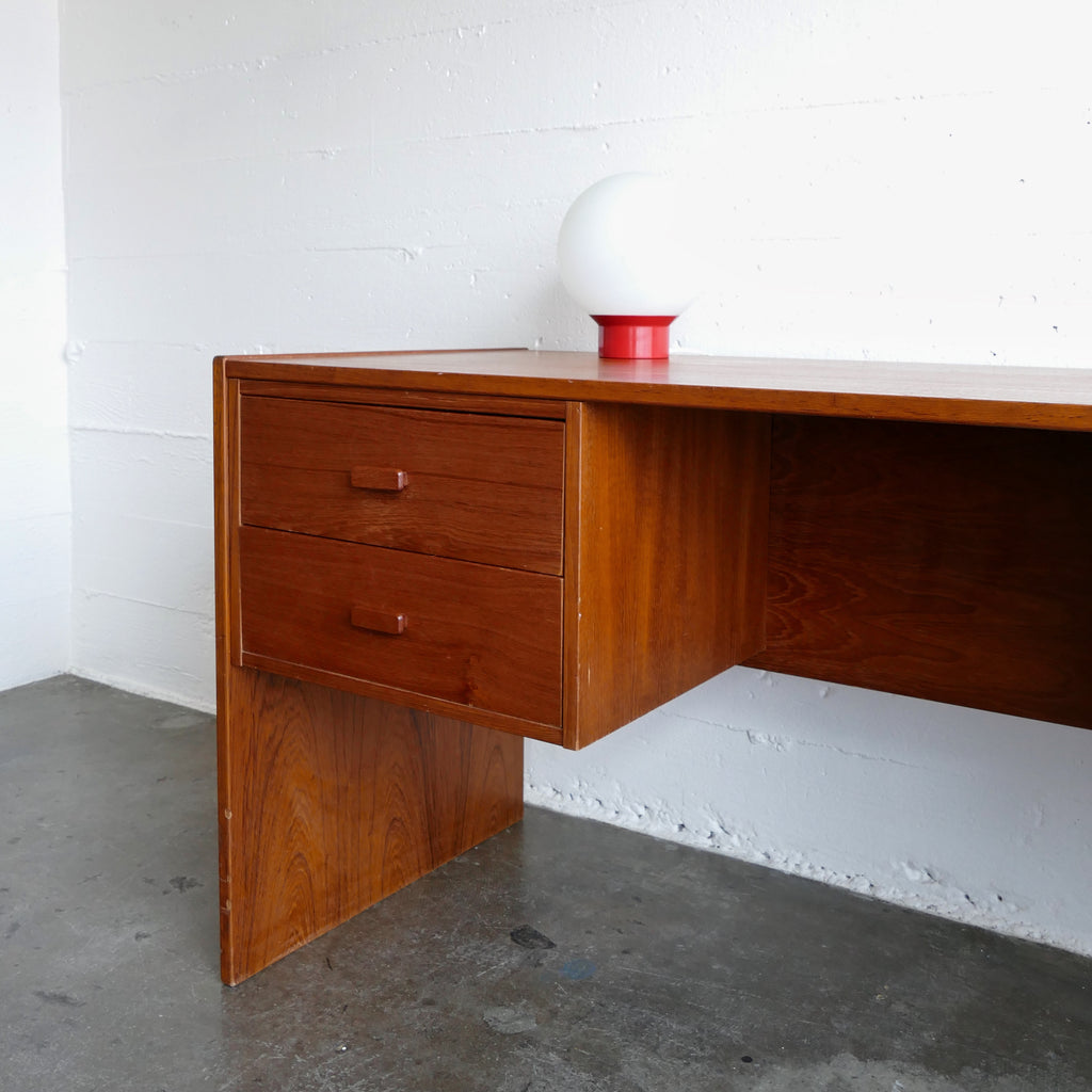 Teak executive desk circa 1970s, made in Denmark by Jesper International. With a sprawling surface that could hold two monitors, you can spread out in style with this desk :) Finished on all sides so it can float in a room; three handled drawers. Overall good vintage condition; nicks presents on edges and a few marks on the top as shown. Priced accordingly.