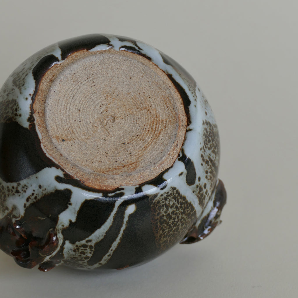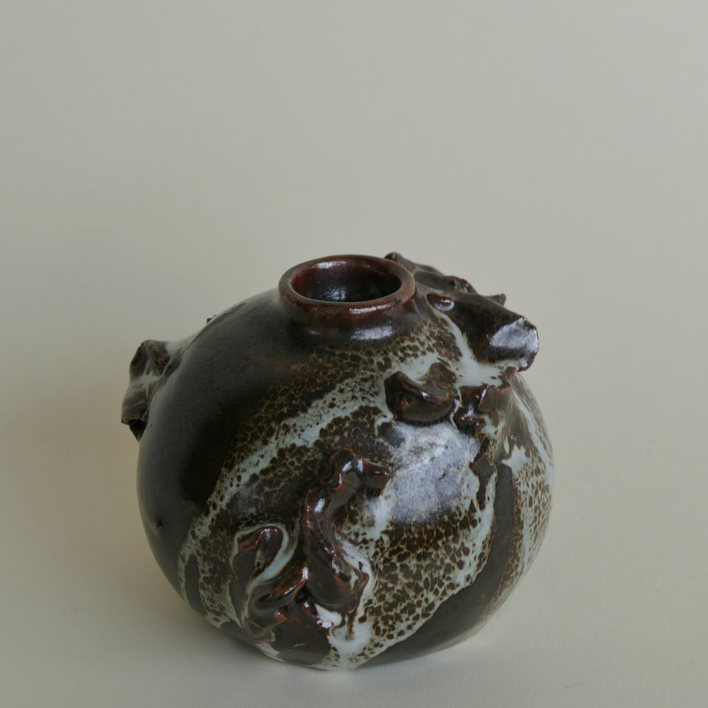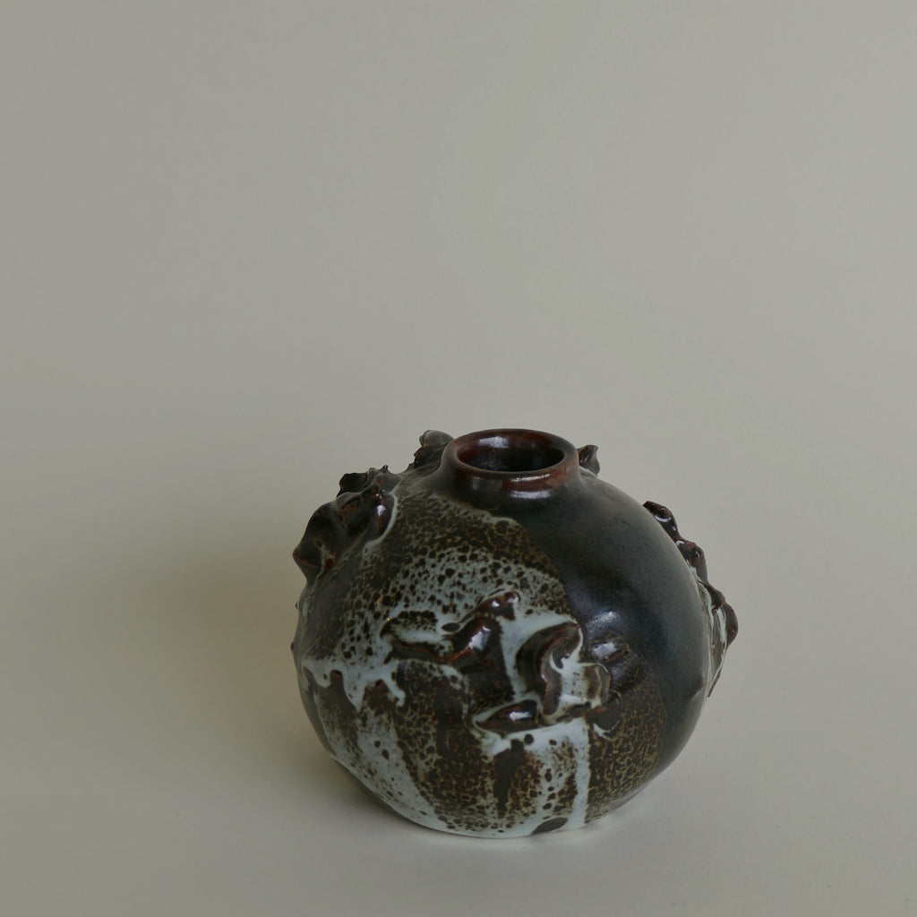 Mid century style bud vase with drippy glaze and ruffled textured detail throughout. Excellent condition; no chips or cracks.