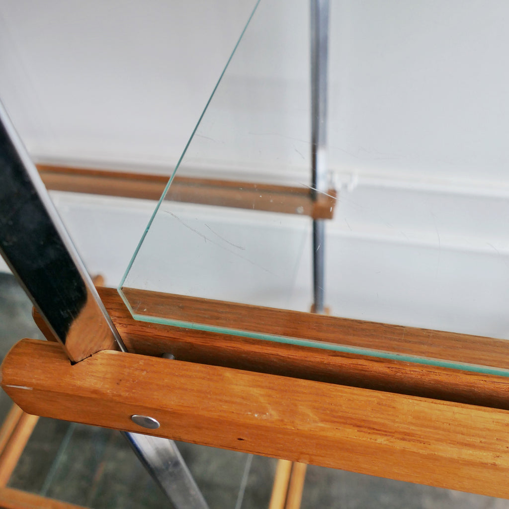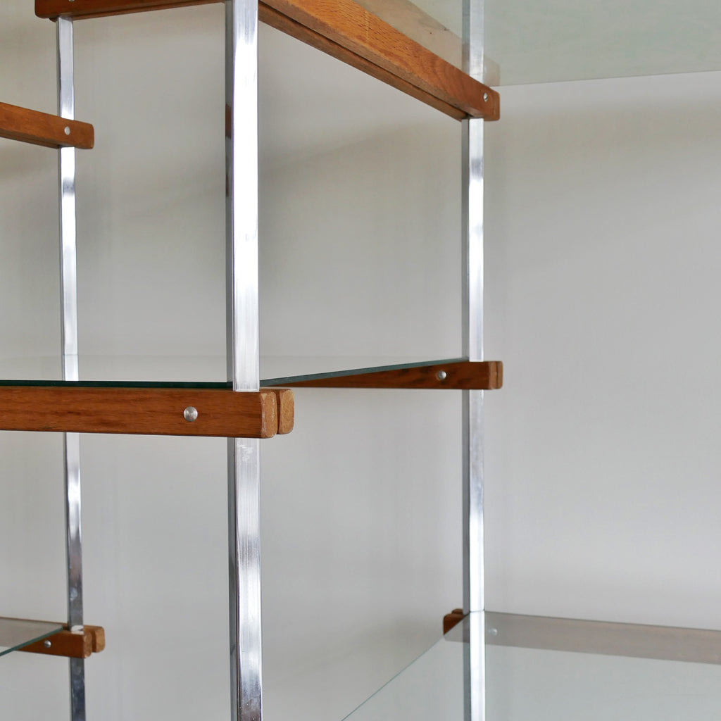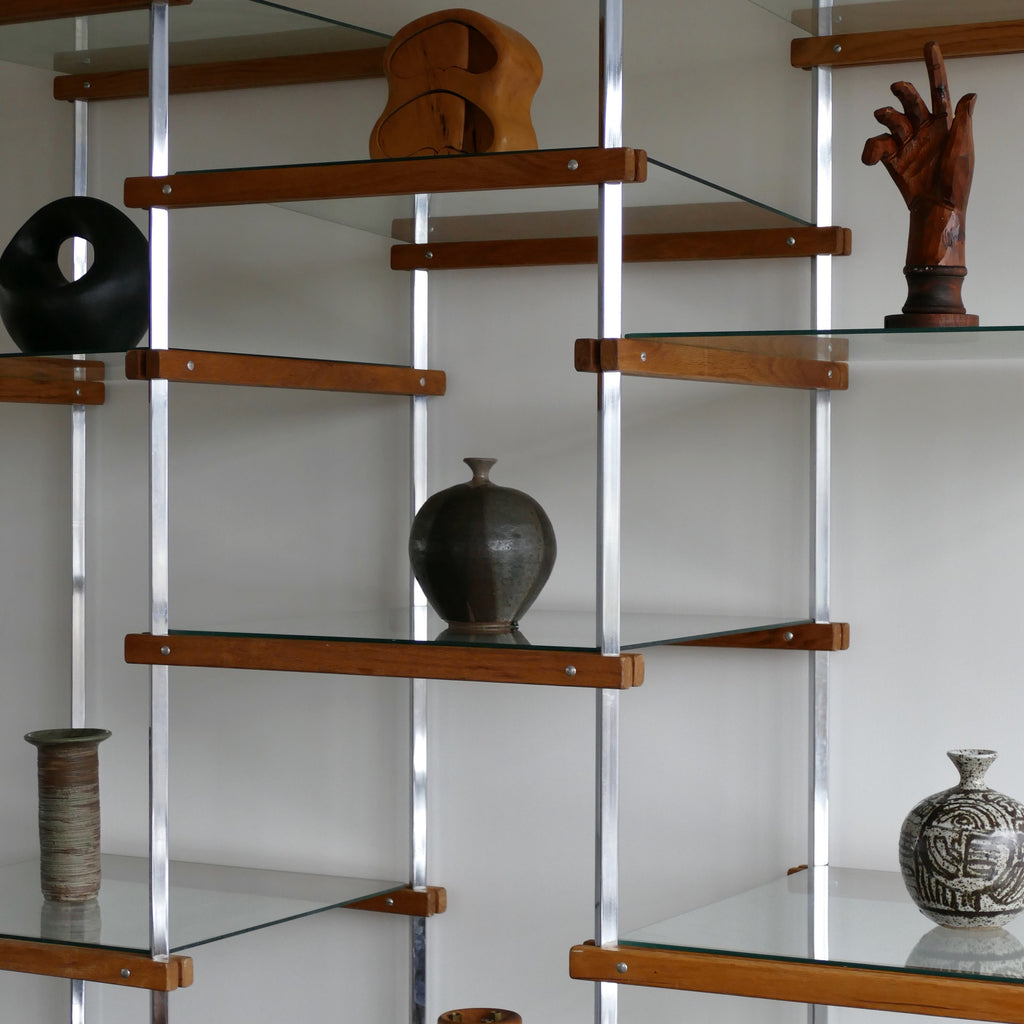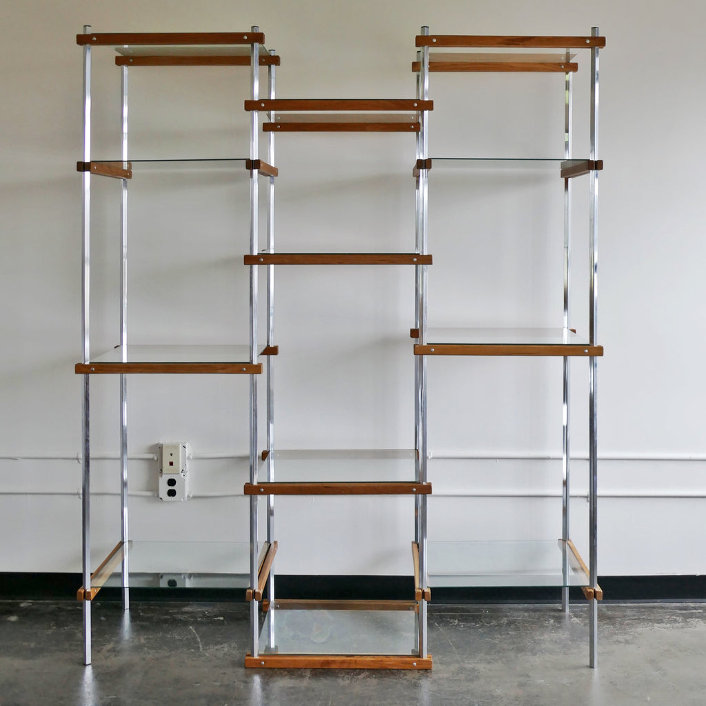 Vintage modular shelving unit comprised of glass, wood, and chrome parts. Shelves are completely adjustable and are set with tension from wood brackets. Twelve total shelves available and can be arranged in various ways, to create one complete freestanding unit or two single freestanding units. Finished on all sides so that it can float in a space. Overall excellent vintage condition; minor scratches on glass surface, one crack in one wood bracket (can be used in very bottom shelf as shown to not be load bearing but it is still functional), minor wear to poles.