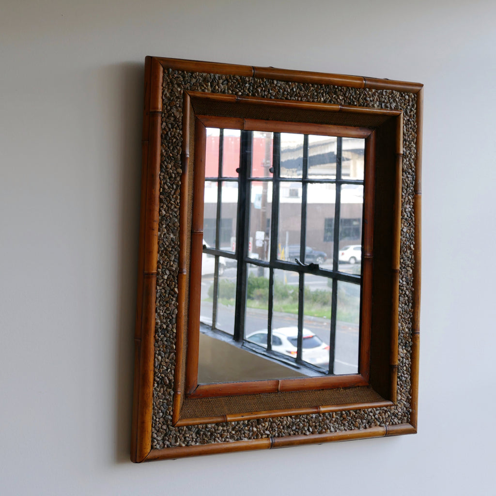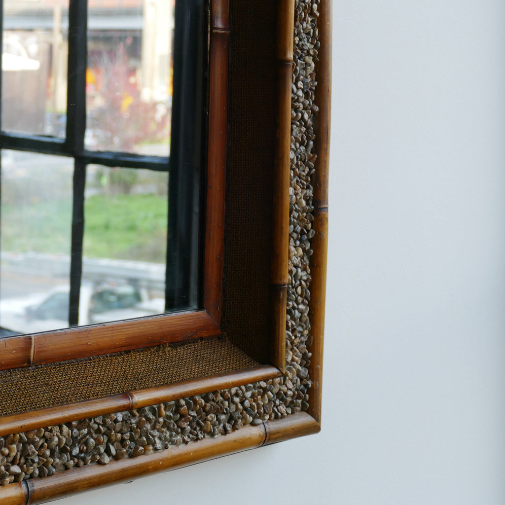 Vintage framed mirror made from bamboo, burlap and pebbles. Layers of texture exist in this piece. Very good retail condition.