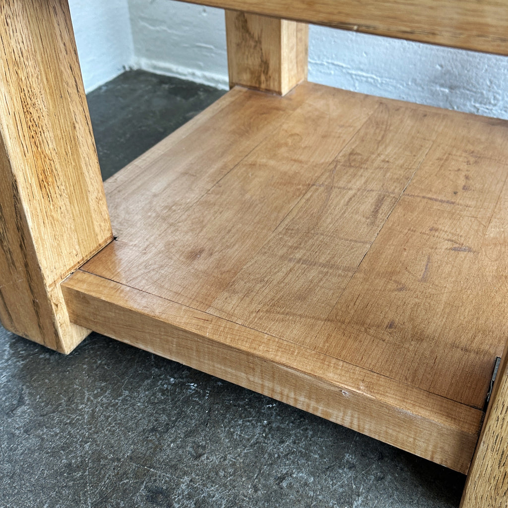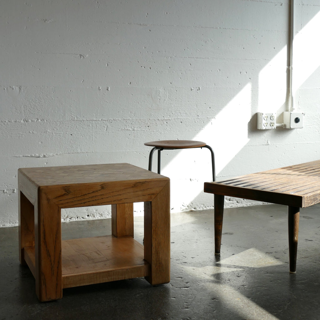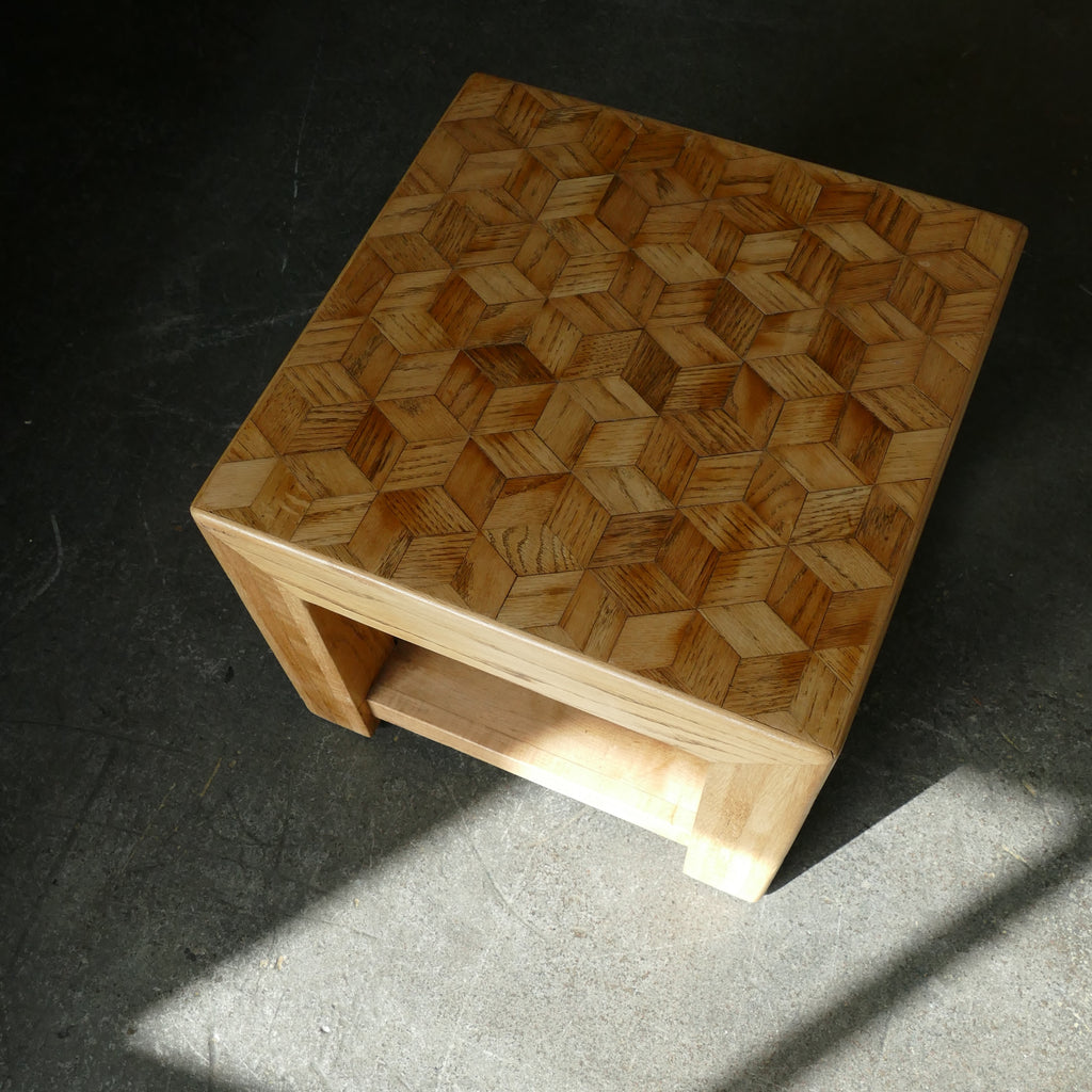 Chunky vintage Parsons end table, featuring optical parquet tiling. One lower shelf.