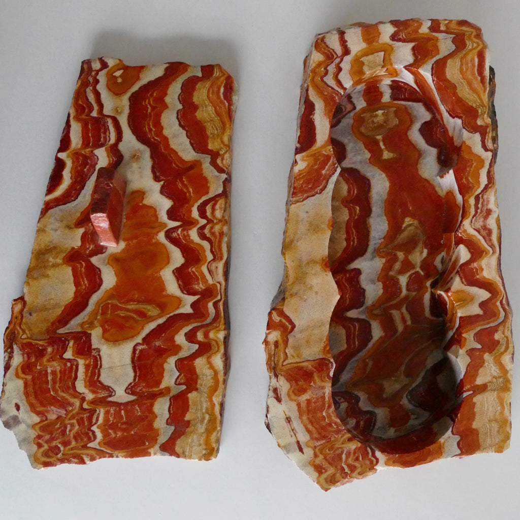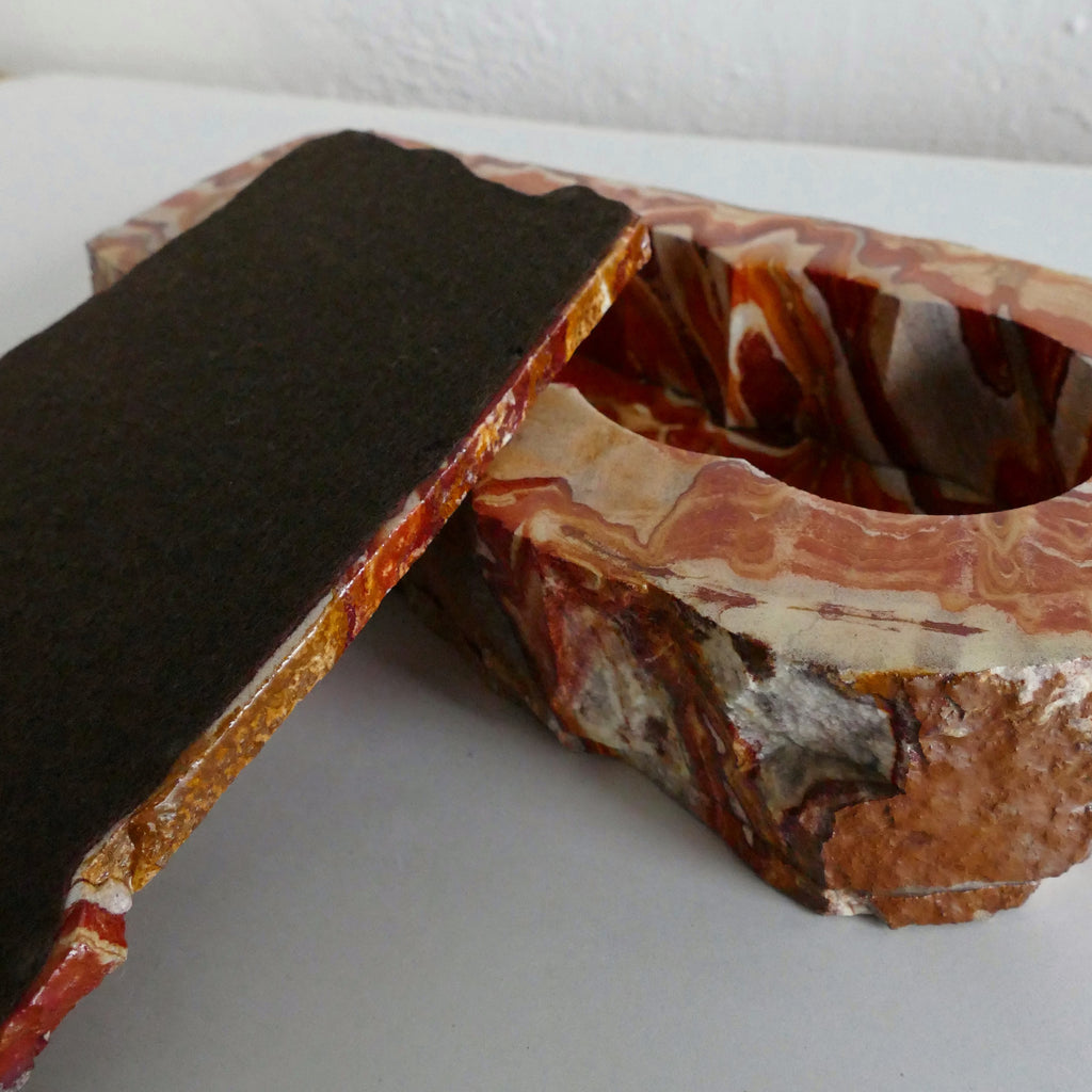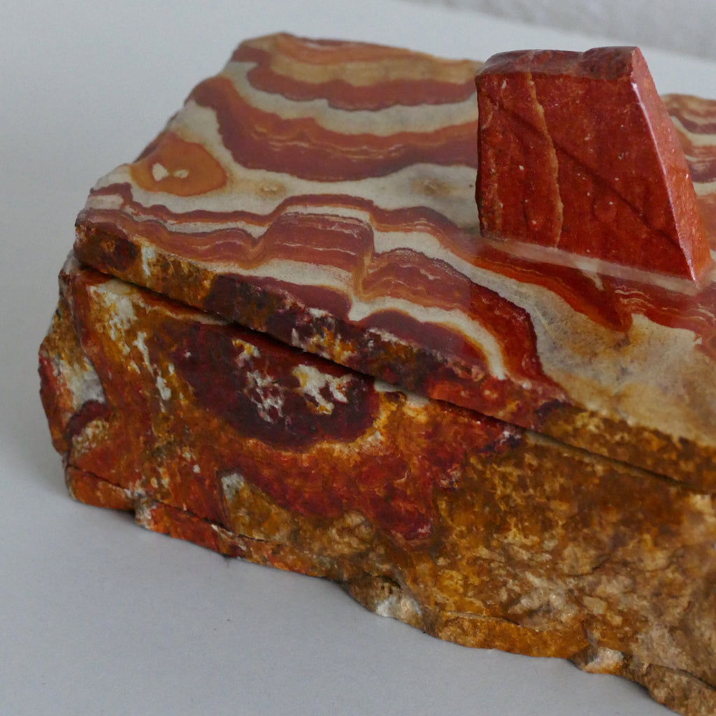 Absolutely crazy good handmade agate stone box with handle and lid. Polished lid and interior. Large, asymmetrical, and with felt lining the inside of the lid and the bottom of the box.