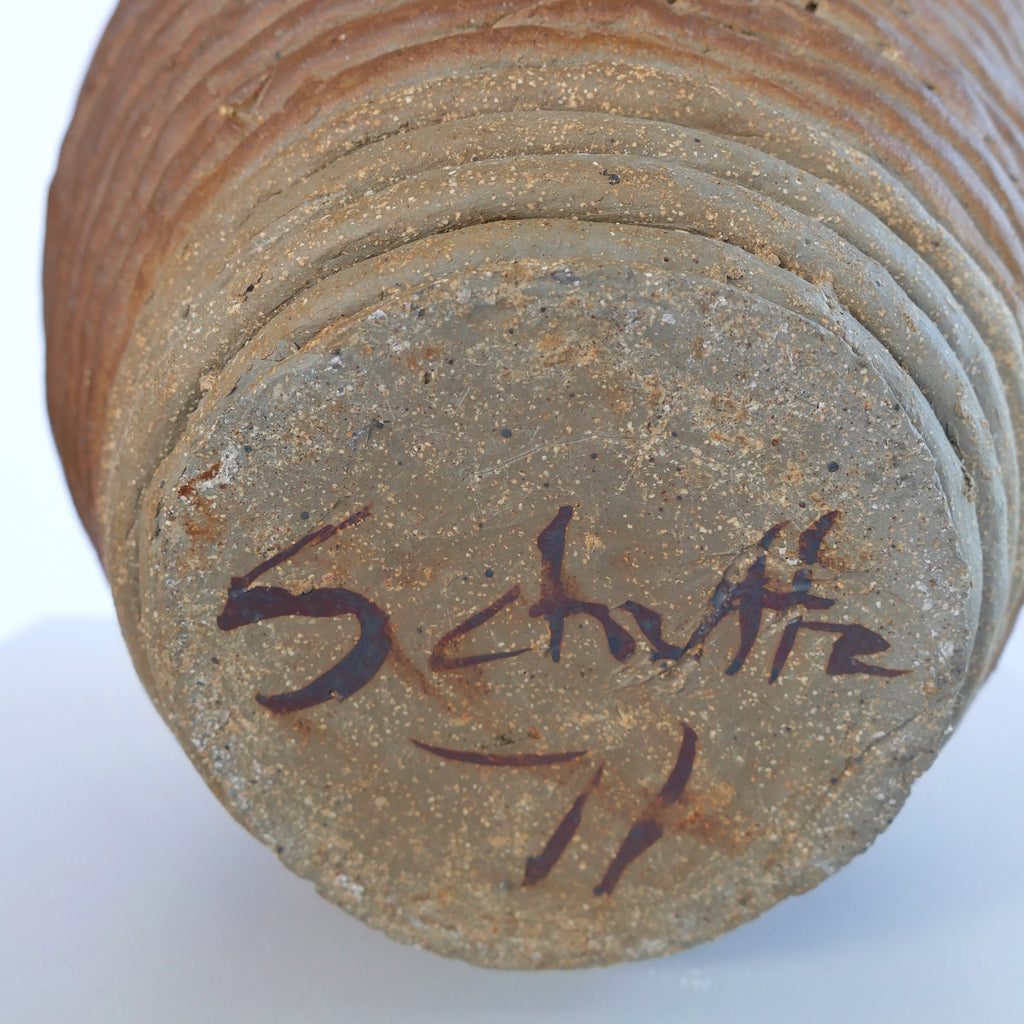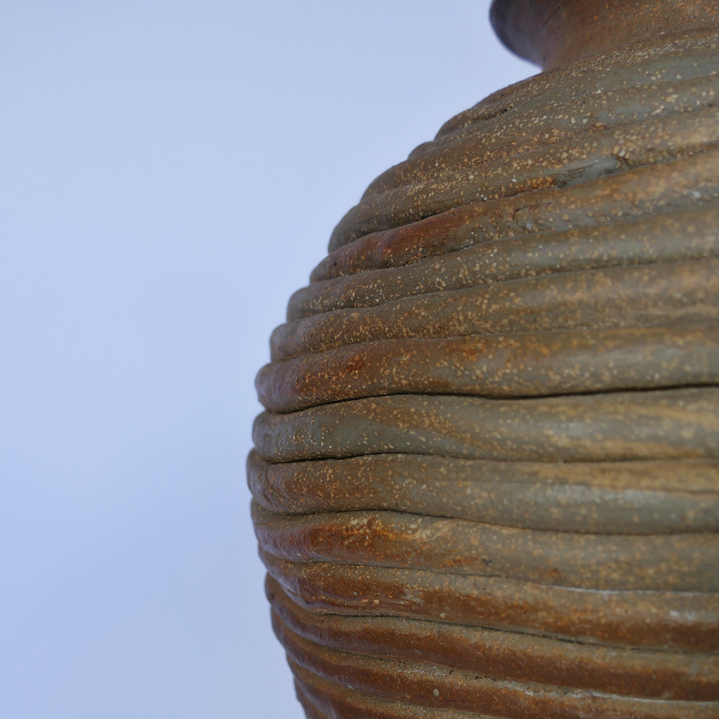 Oversized handmade coiled vessel or vase. Great size, tones and presence. One small chip on underside of lip.