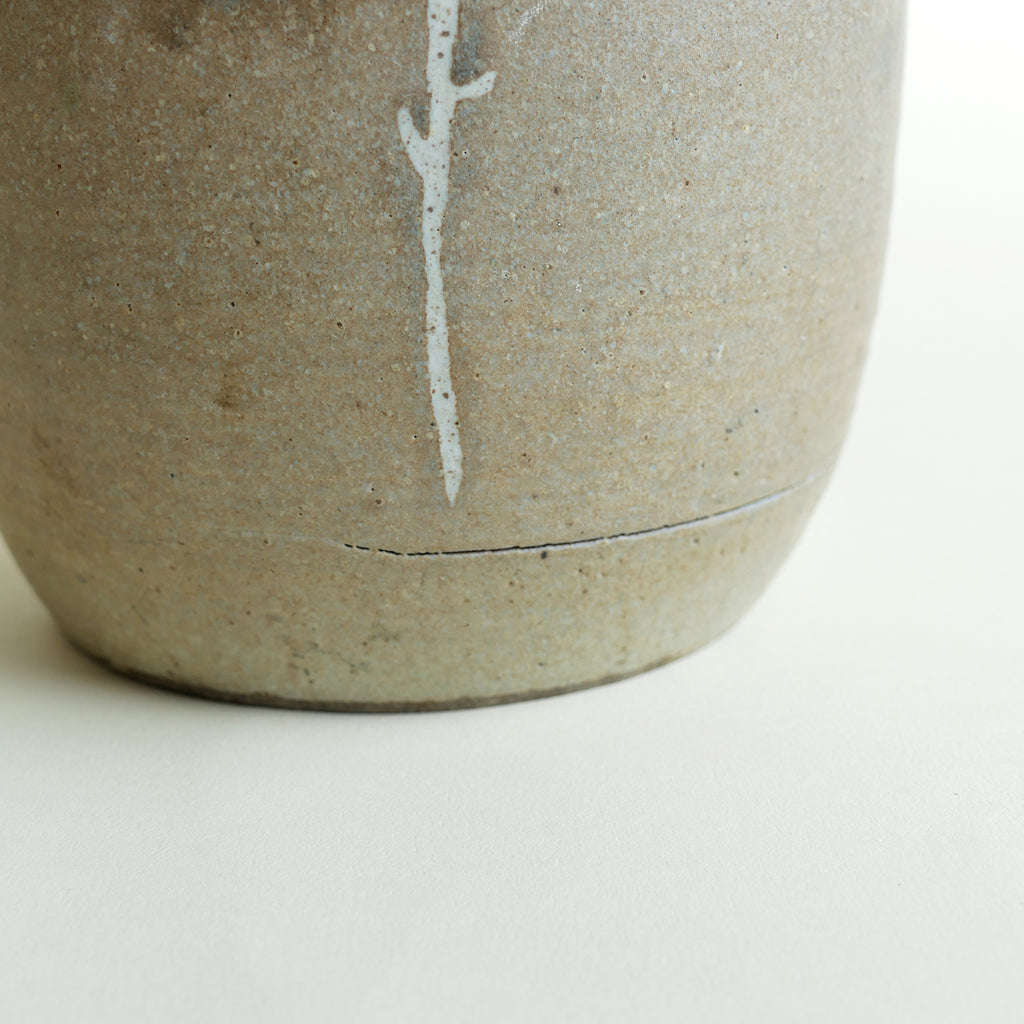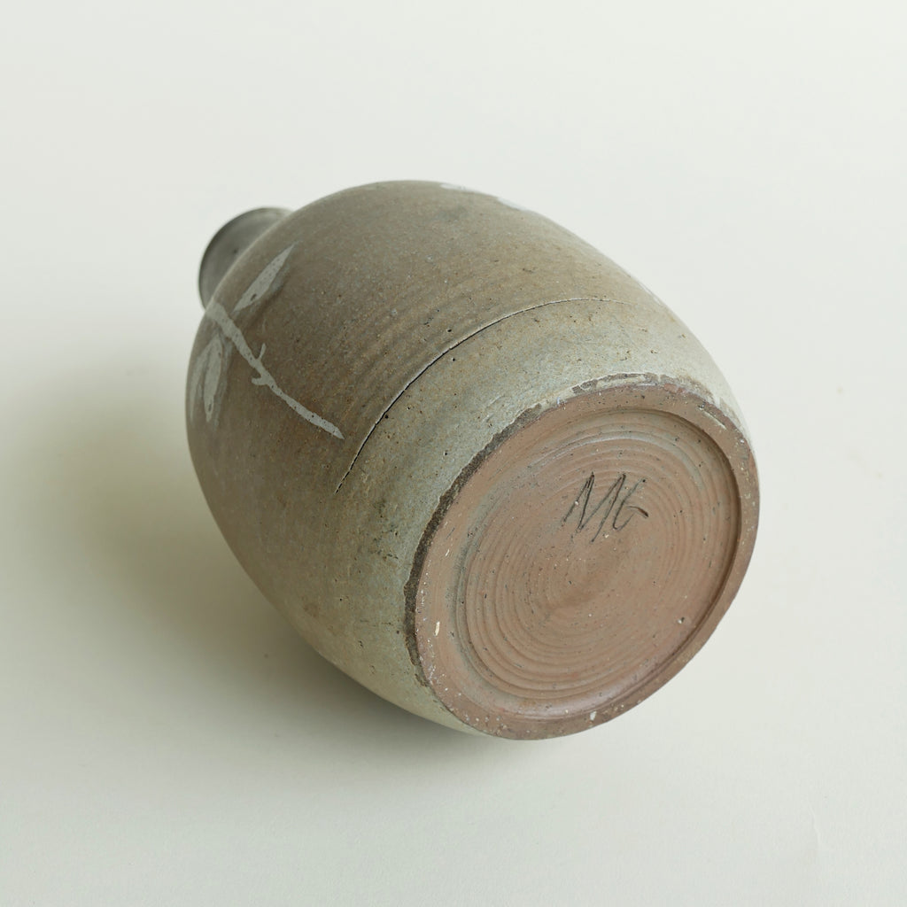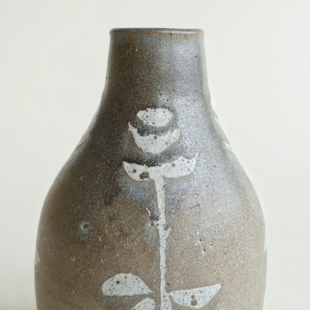 Charming ceramic vase with wax resist floral pattern. Gray-brown glaze with a hint of blue around the flowers. Excellent condition.