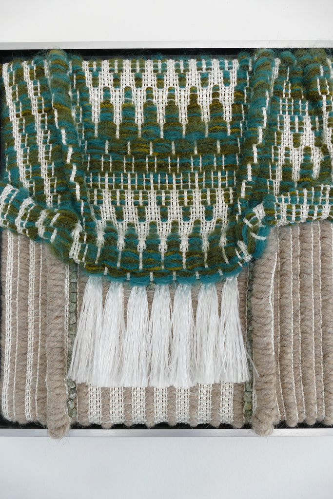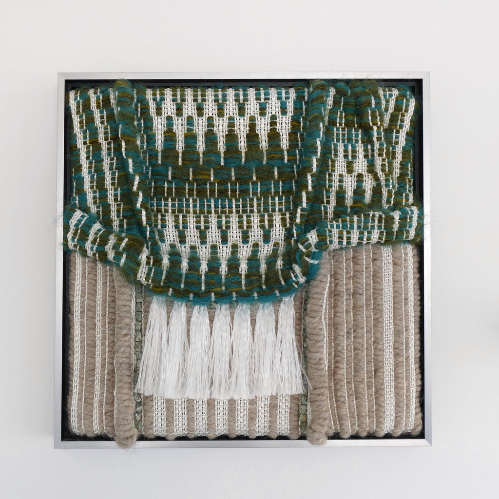 Mounted fiber art in greens and tans, lovely and textural. Small green beads are carefully woven in! Finished in a nice black frame to help this piece stand out anywhere.