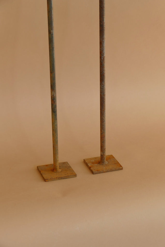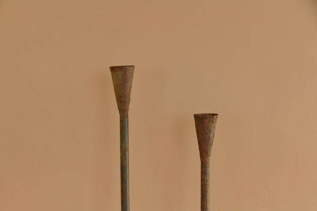 Asymmetrical pair of vintage patinated candlesticks. Large in scale, great texture.