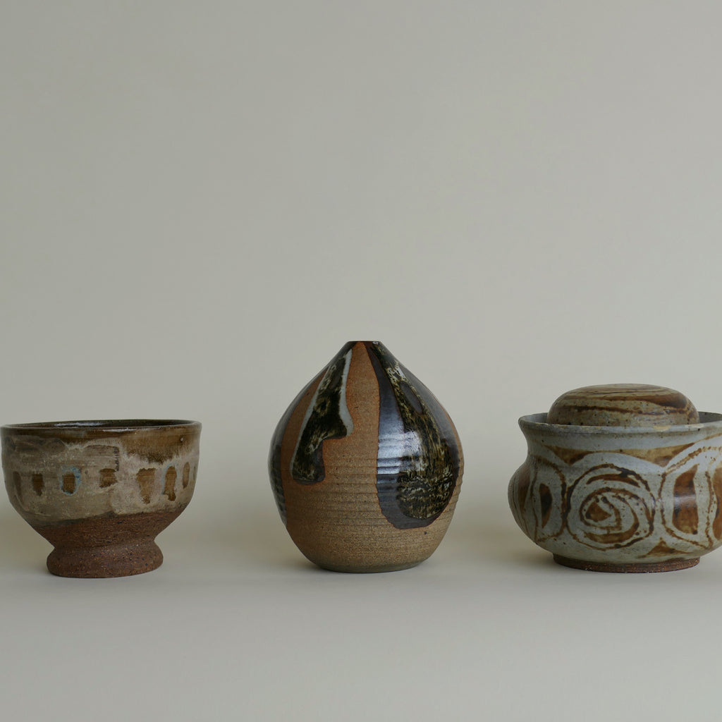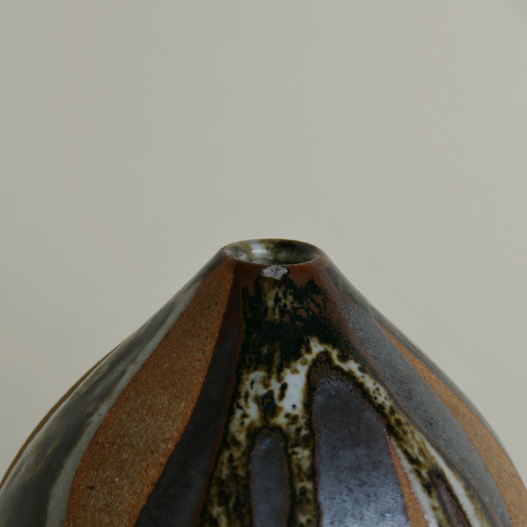 Mid century weed pot with a drippy brown glaze. Excellent condition; one very small chip in lip as shown.