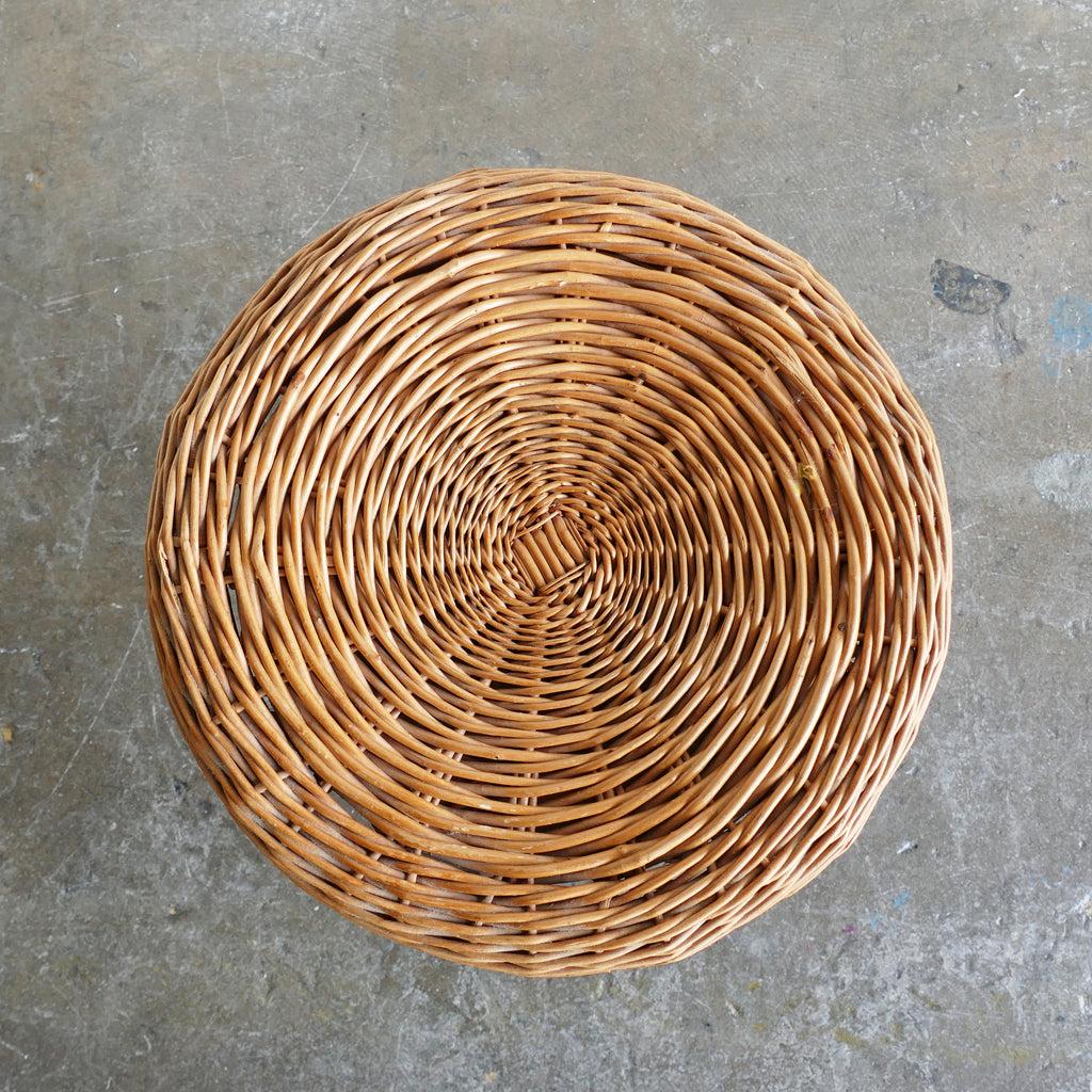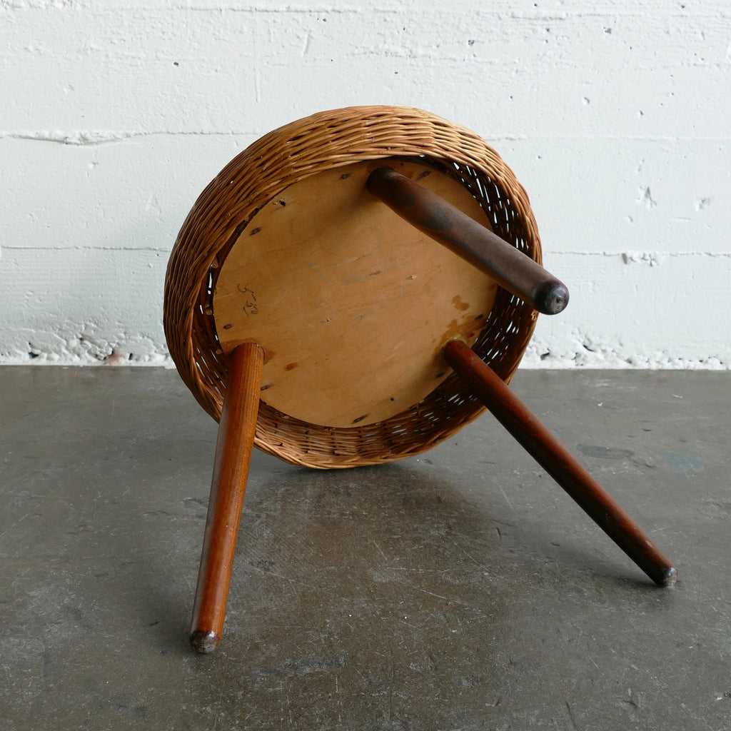 Wicker tripod stool after Tony Paul, circa 1950s. Wonky seat as shown, but sturdy enough to support a plant or books. Lovely accent piece for someone who appreciates mid century design.