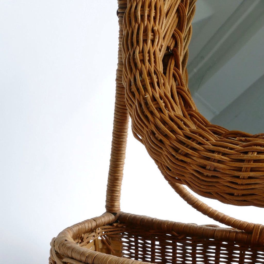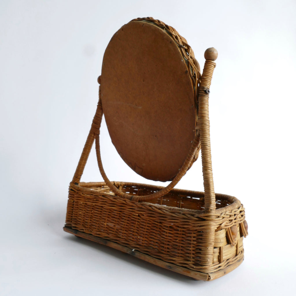 Sweetest tabletop wicker mirror, reminiscent of the antique stick and ball style of furniture. This piece is delicate; a few very minor breaks in wicker. One screw attaching mirror to frame is loose. Place at your entry way for one last look before you dash out, or put on top of a dresser.