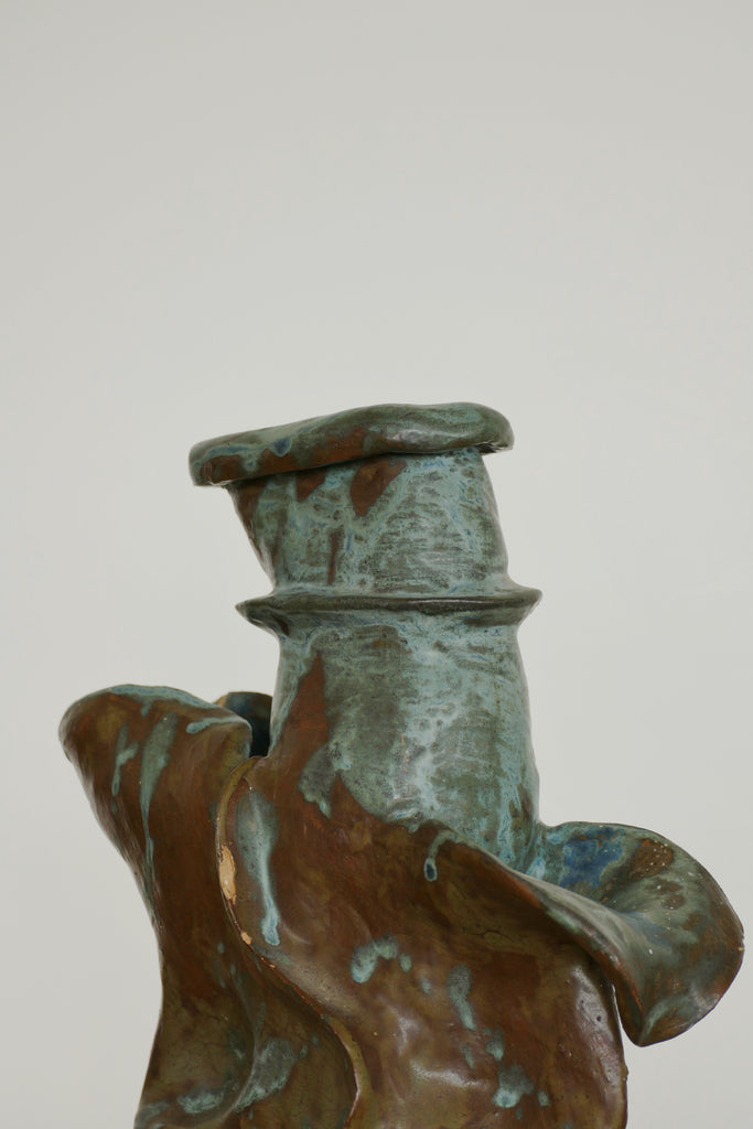 Amateur hand built pitcher-shaped vase or sculpture. Great lines and movement. Minor chips in glaze as shown.