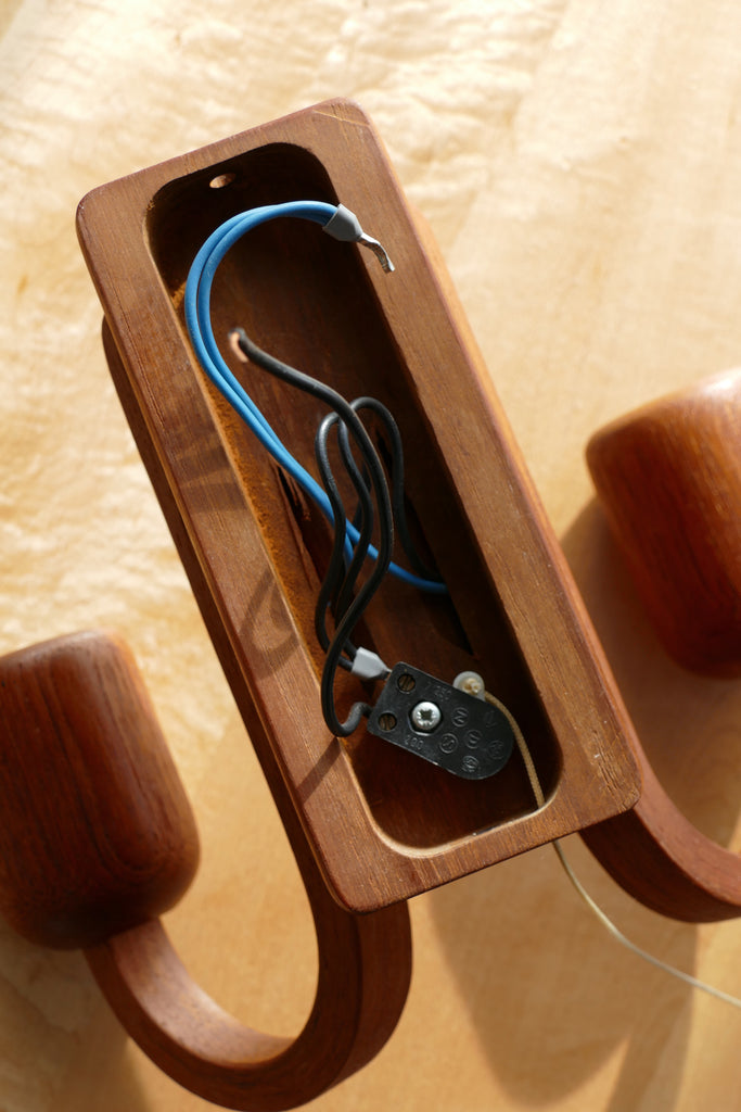 Vintage teak wall sconces by Domus, circa 1960s-1970s. Hardwired with two sockets per sconce. These could be converted to plug-in; not shown is a hole that a wire could thread through between the two arms of the sconce. Sold invididually. Two available. To purchase both, add to cart twice.