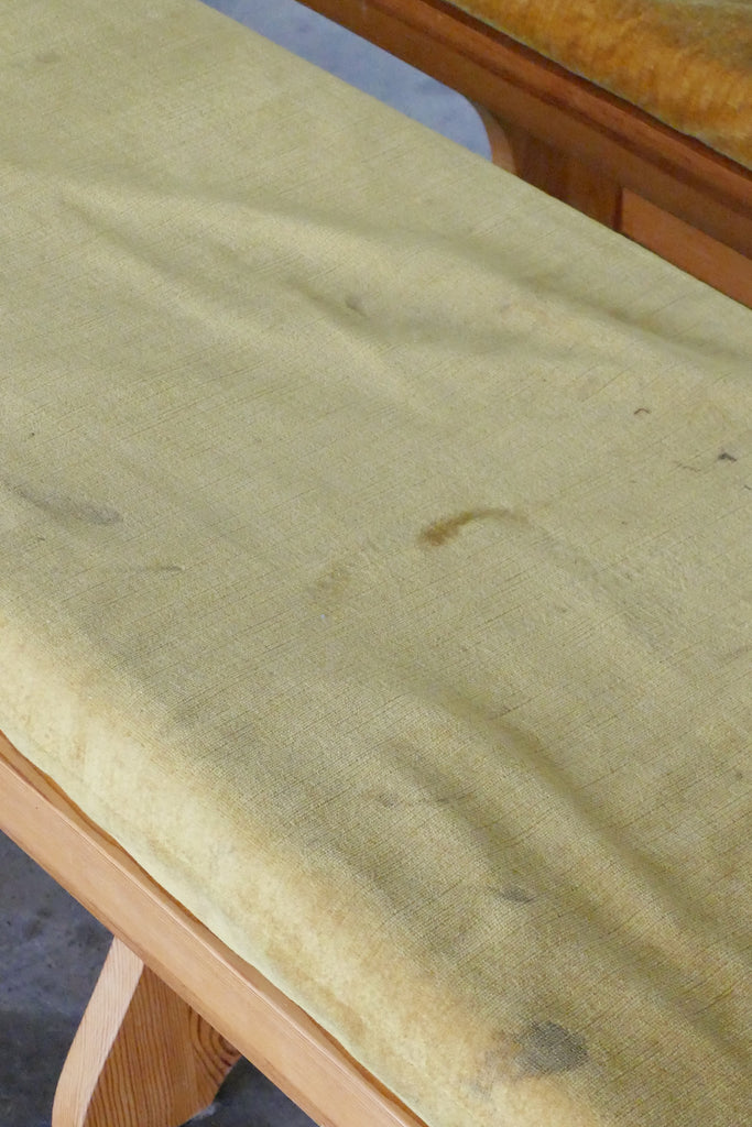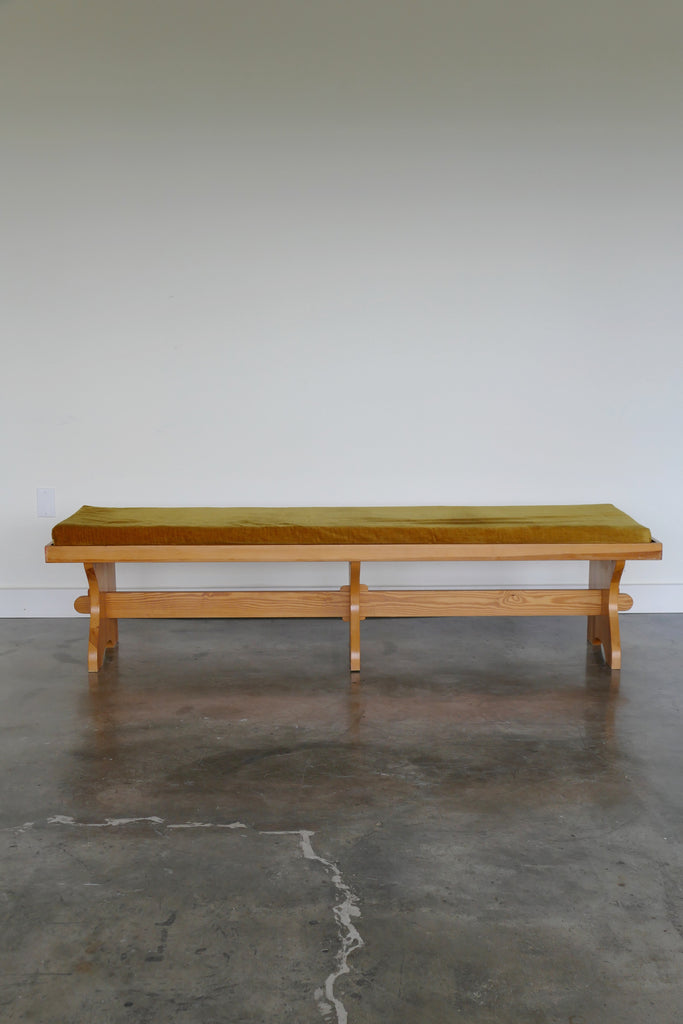 Chunky Swedish pine bench with cushion as found, circa 1970s. Cushion is stained but foam is intact. Would look amazing in new fabric. Minor age-appropriate surface wear on wood as shown.