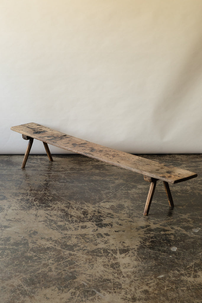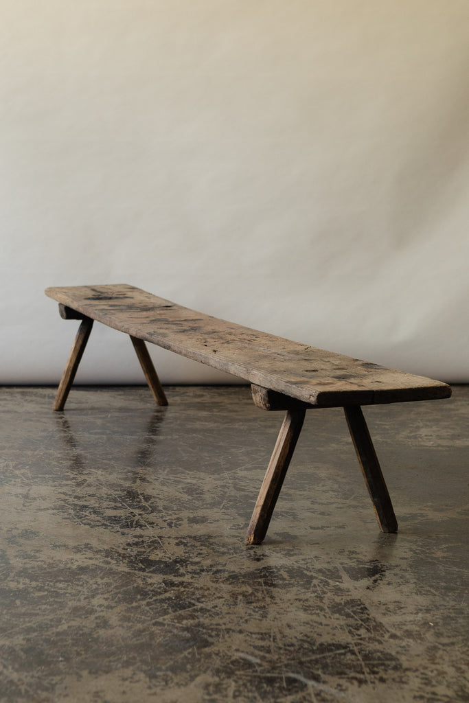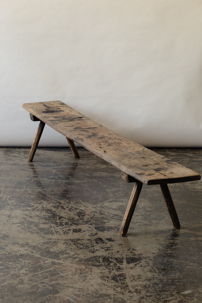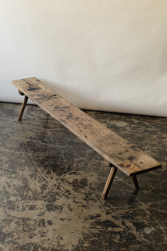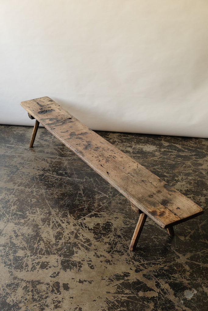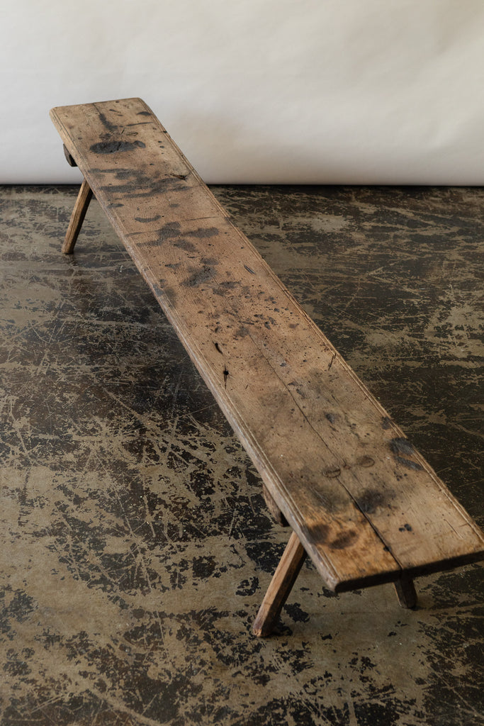 An incredible new piece to the studio. This extra long primitive French bench has patina, warmth and stories to tell. Nice and low for your favorite books and objects. Sturdy but not suitable for sitting. A piece to build a whole room around. Excellent vintage condition with age-appropriate wear.