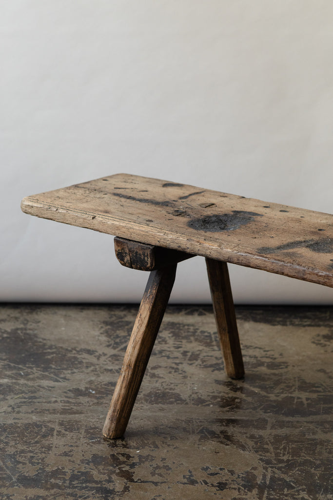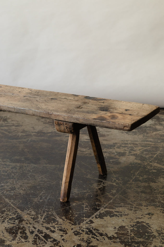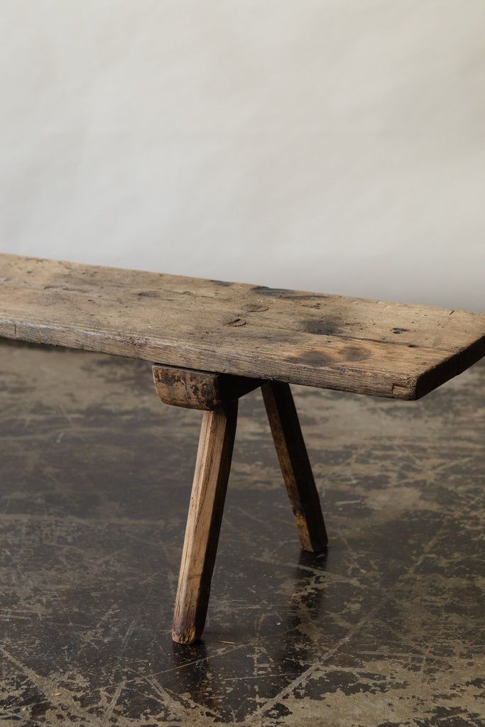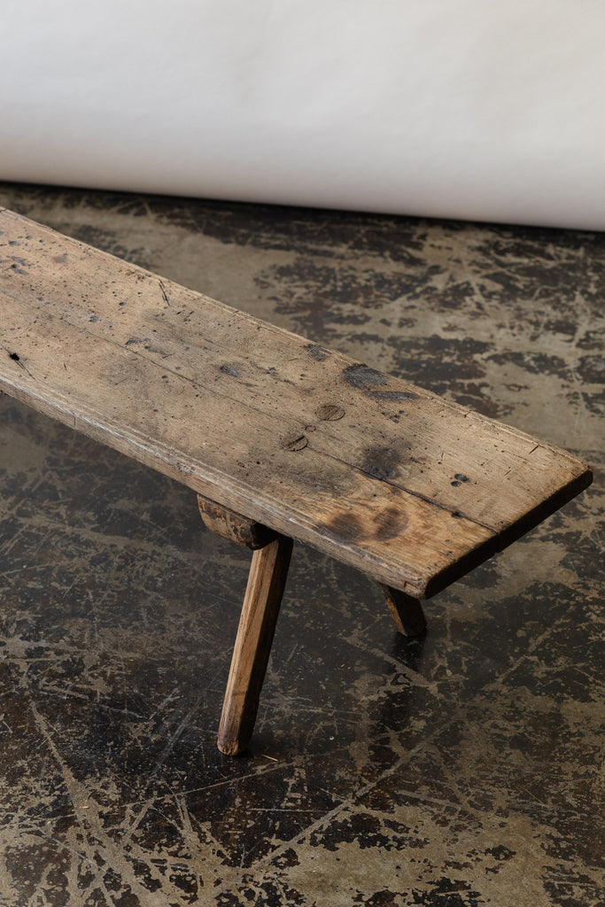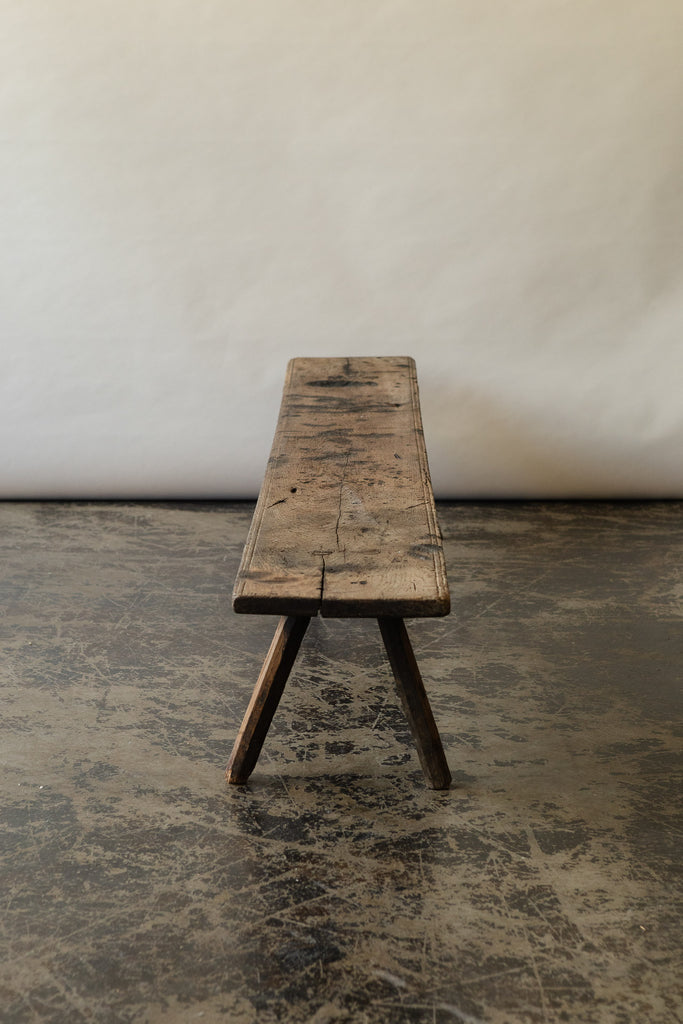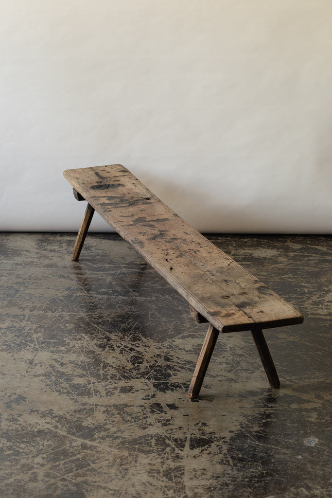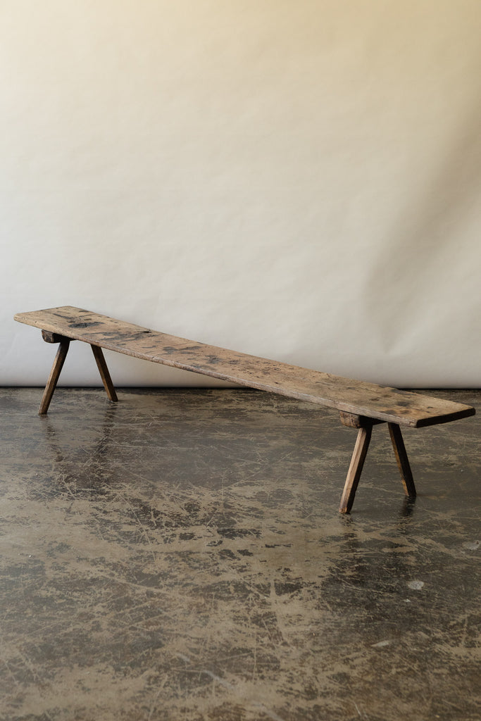 An incredible new piece to the studio. This extra long primitive French bench has patina, warmth and stories to tell. Nice and low for your favorite books and objects. Sturdy but not suitable for sitting. A piece to build a whole room around. Excellent vintage condition with age-appropriate wear.
